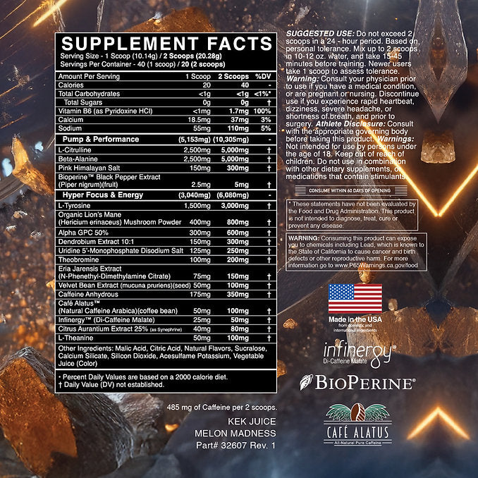 Featured Ingredients: L-Citrulline, Beta-Alanine, Organic Lion's Main, Uridine 5'-Monophosphate, L-Tyrosine, Alpha GPC, Dendrobium Extract, Eria Jarensis Extract, Citrus Aurantium, 485mg of Caffeine.